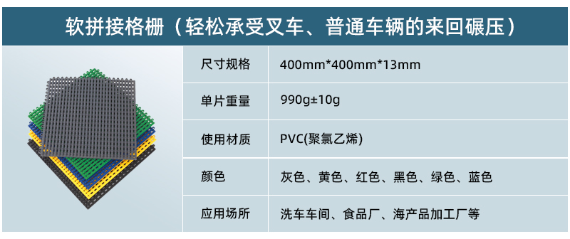 正和軟拼接格柵(專(zhuān)利號(hào)ZL201520725751.X)由加厚型實(shí)心條狀支撐縱橫交織,寬大的排水孔便于水和泥沙的排出和流動(dòng)。下方密布數(shù)百個(gè)實(shí)心防滑支撐點(diǎn),每平米承重高達(dá)10噸以上,輕松承受叉車(chē)、普通車(chē)輛的來(lái)回碾壓,特別適合在洗車(chē)車(chē)間、食品廠(chǎng)、海產(chǎn)品加工廠(chǎng)等有水地面,也可以作為企事業(yè)單位迎賓除塵墊使用。