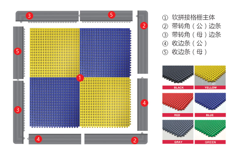 正和軟拼接格柵整體為正方形結(jié)構(gòu),采用矩陣式密集鎖扣連接,扣接牢固,施工簡(jiǎn)單,多種色彩可供搭配,鋪設(shè)之后整齊美觀(guān)。產(chǎn)品整體采用軟性材料,讓清掃衛(wèi)生變得更加簡(jiǎn)單,只要將整體地面卷起即可清理下方地面,高效便捷。