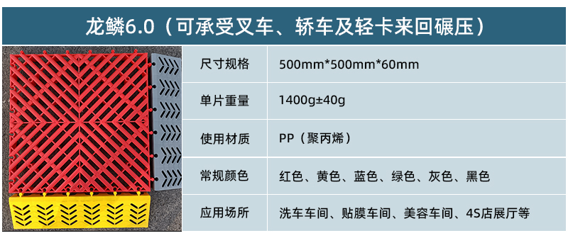 1.龍鱗紋設(shè)計(jì),防滑,美觀,寓意好 2.選用高級(jí)原料,加入其他輔料,顏色亮麗,無異味,無污染 3.顏色為紅黃藍(lán)綠黑灰六色,滿足客戶用色需求,搭配屬于自己的風(fēng)格 4.通扣鎖扣設(shè)計(jì),容易鋪設(shè)且容易拆卸打理 5.加強(qiáng)支撐,不容易出現(xiàn)壓壞壓斷現(xiàn)象,滿足大多數(shù)車輛施工的要求 6.使用年限長(zhǎng),3年超長(zhǎng)質(zhì)保,使用無后顧之憂 7.不同厚度,采用不同支撐,保證承載最大化的同時(shí),且易排泥排水